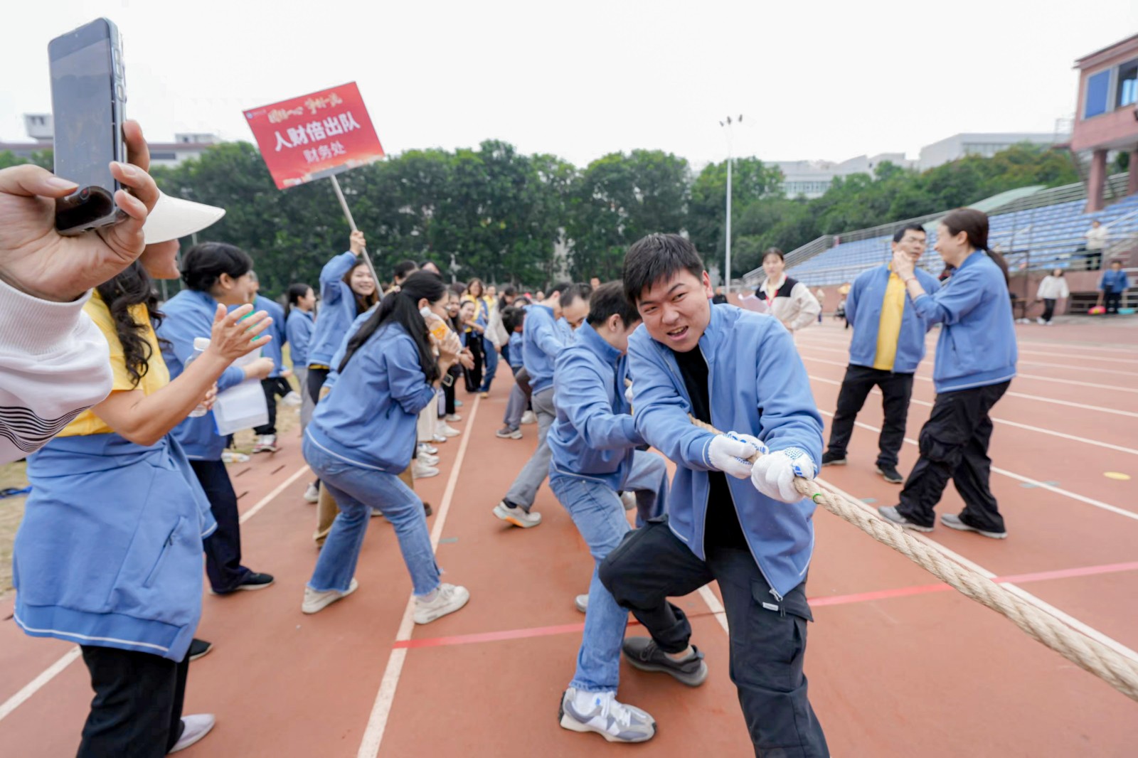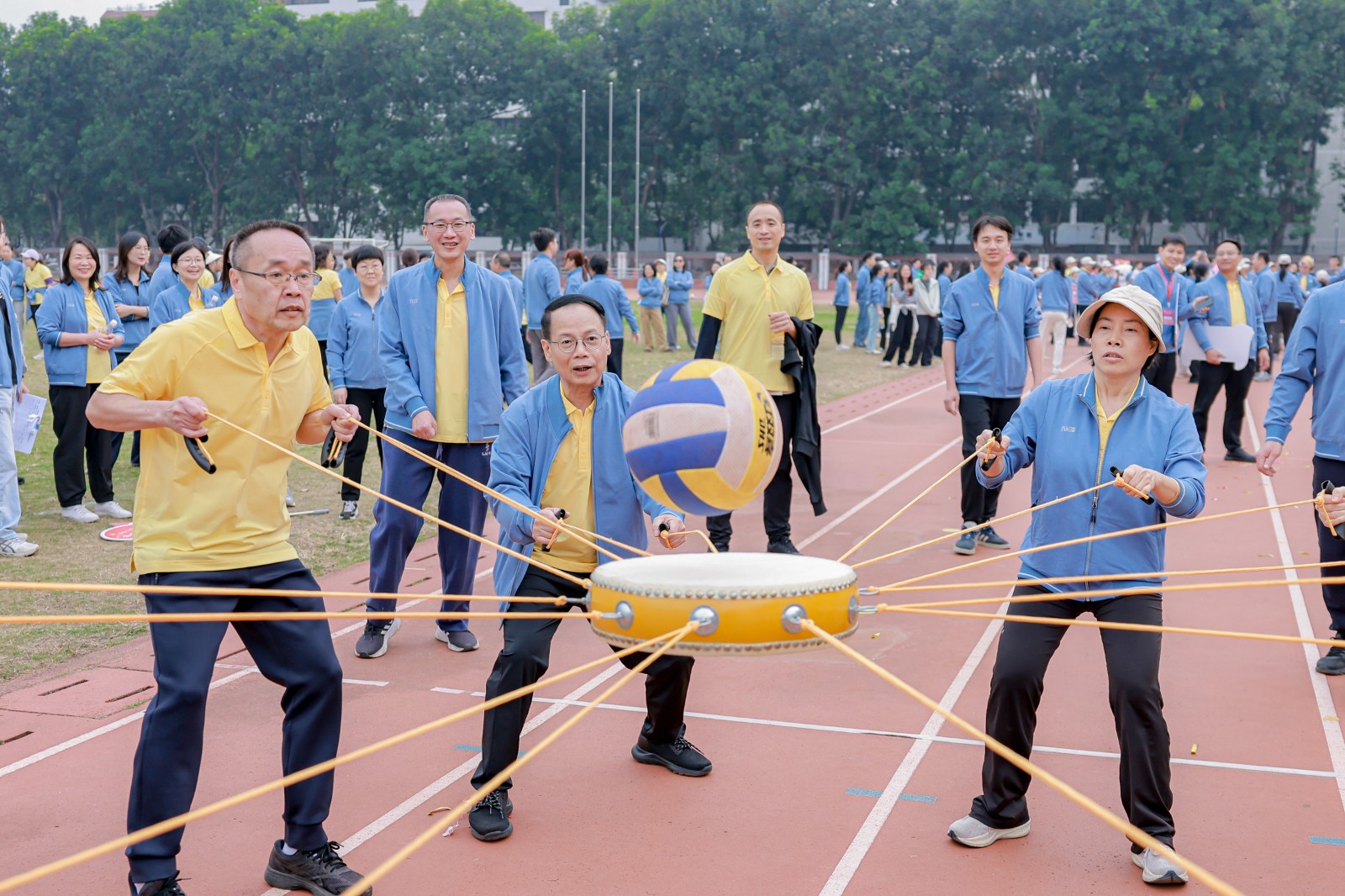 18支队伍依次以响亮口号亮相,在“团队气势大比拼”中展现了独具特色的团队风采。本次活动由展现集体力量的拔河、考验团队默契的击鼓颠球和比拼速度与协作的迎面接力跑三个集体项目组成。各单位各部门以独立成队和联合组队方式参加,校领导全程参与、全情融入,与各队伍教职工并肩作战、默契配合。现场比赛紧张激烈,各队伍齐心协力,力争好成绩。赛事间隙,各队伍各部门互动留影、集体打卡,气氛热烈,共迎新年。