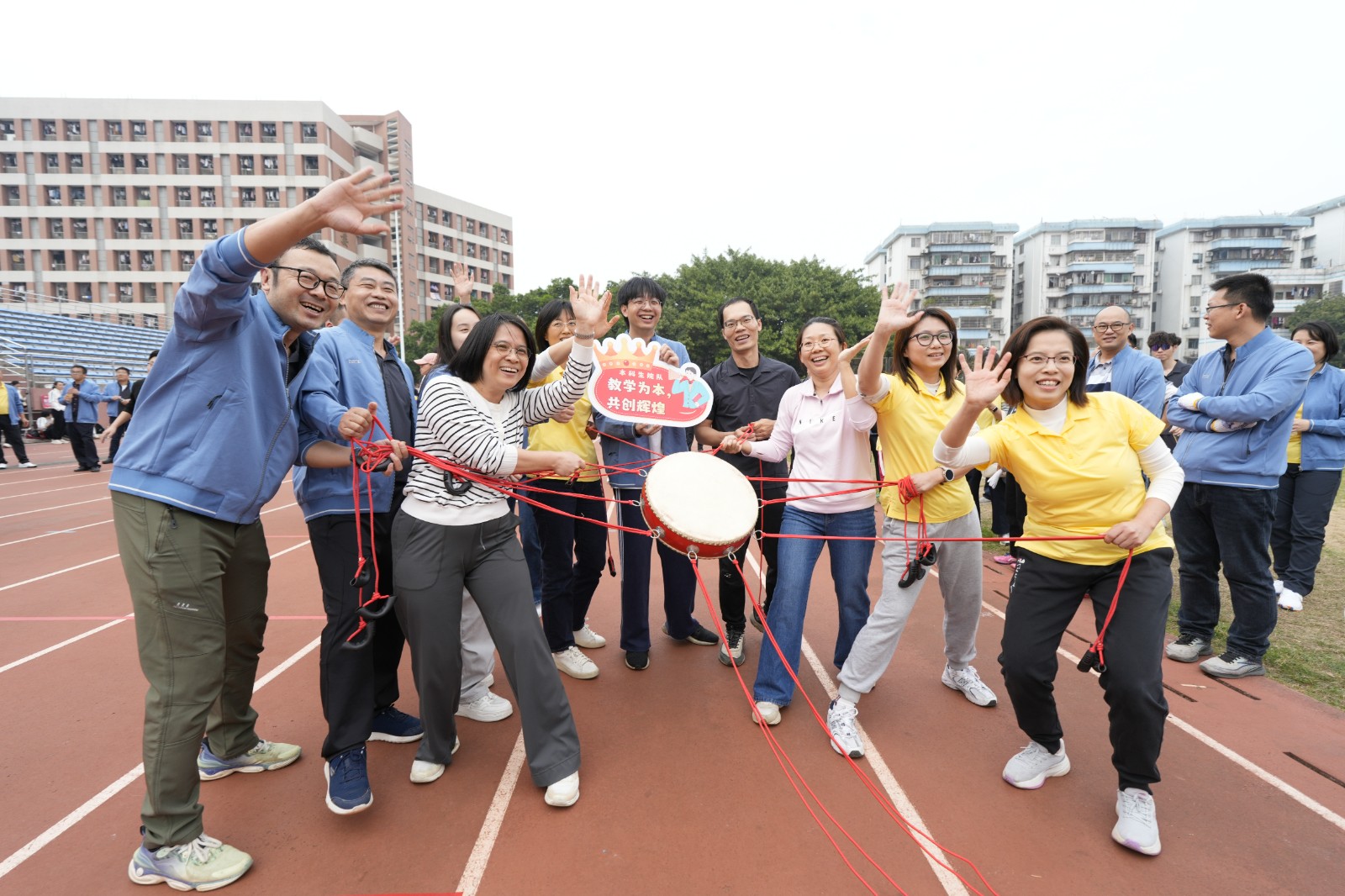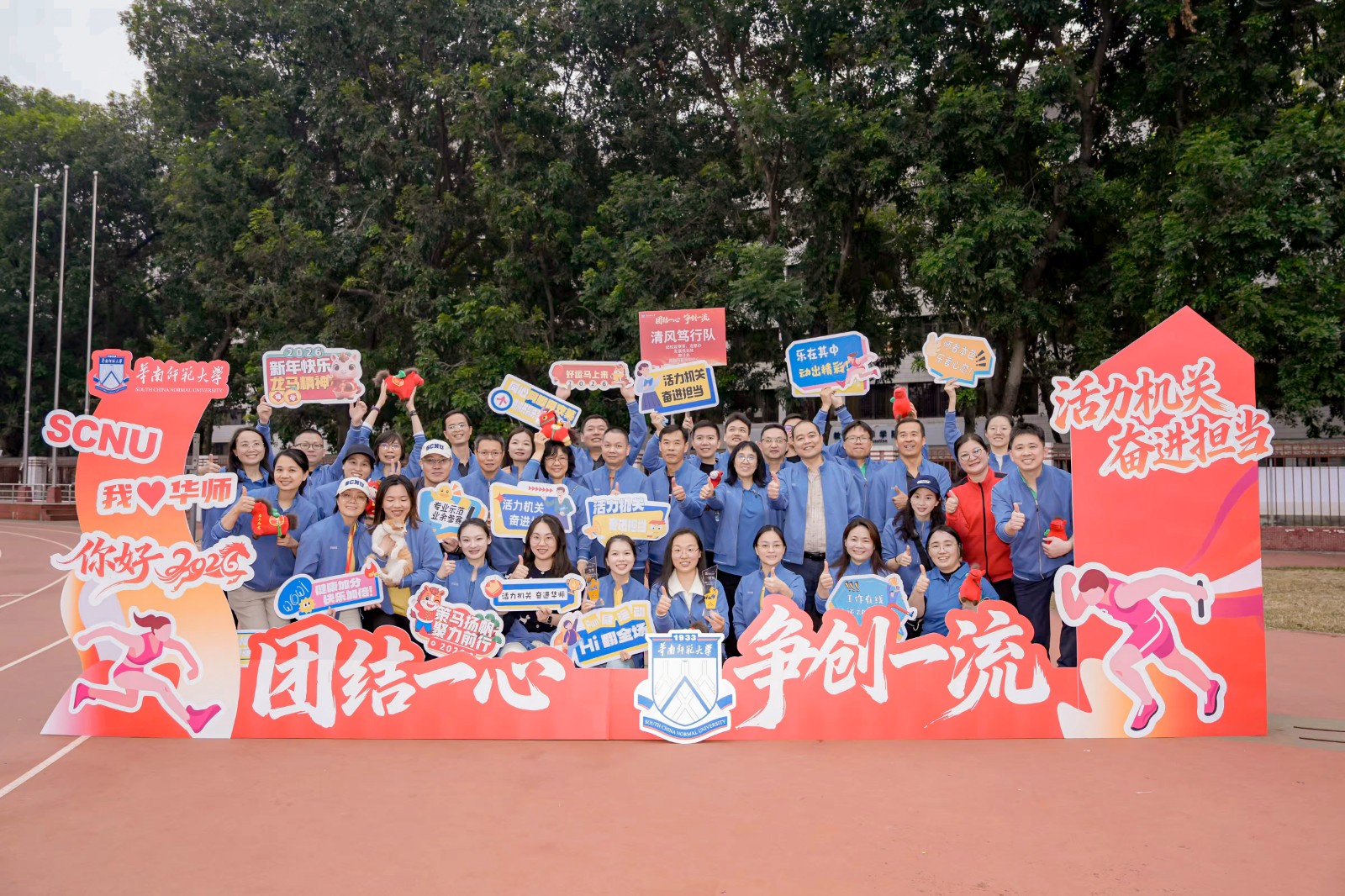 为进一步凝聚思想共识、激发队伍活力、促进协同融合,12月31日下午,学校机关党委、机关部门工会在广州校区石牌校园西区田径场举办“团结一心 争创一流”2026迎新年活动,以“主题党日+工会活动”形式迎接新年。校党委书记王恒胤,党委副书记王岩、陈晓方,党委常委、副校长刘剑文、阳成伟、潘文庆出席活动,机关党委全体党员、机关部门工会会员600余人参加。