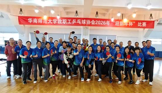 为加强我校乒乓球会员的交流,增进感情友谊,提高球技,华南师范大学教职工乒乓球协会于2025年12月27日在南区体育馆五楼成功举办了2026年“迎新年杯”乒乓球比赛。本次活动是华南师范大学教职工乒乓球协会着力打造的年度品牌赛事,旨在通过乒乓球这一载体,搭建教职工之间、教职工与校友之间的交流平台。
