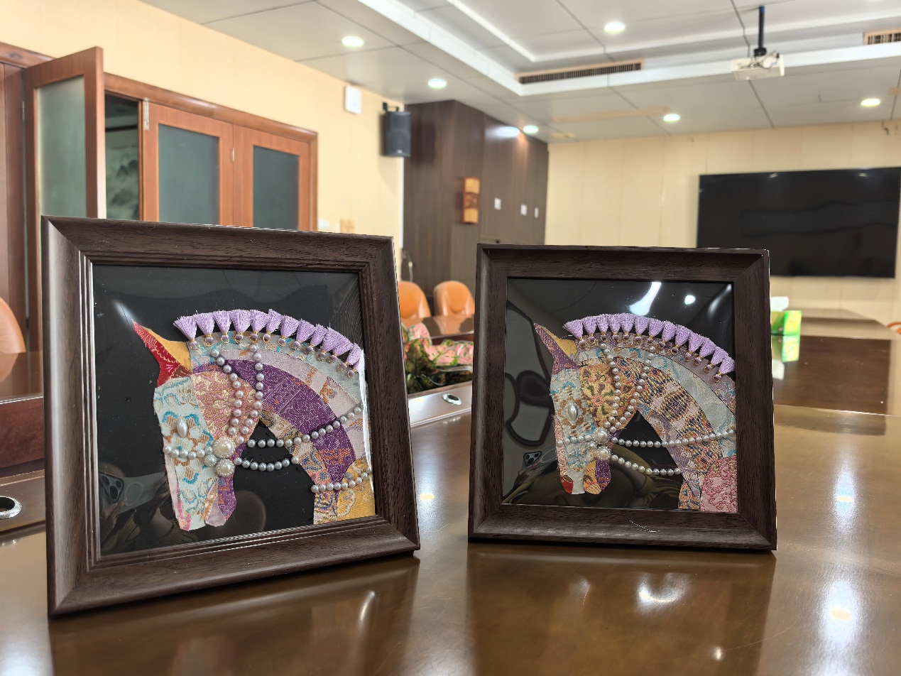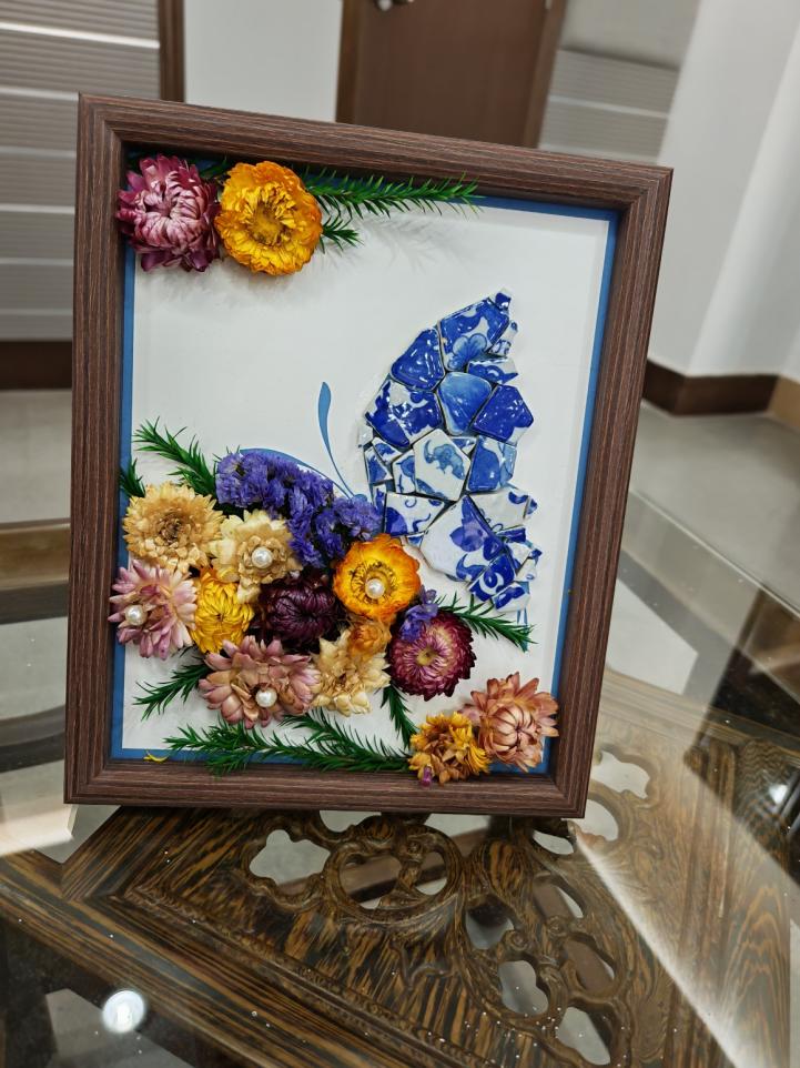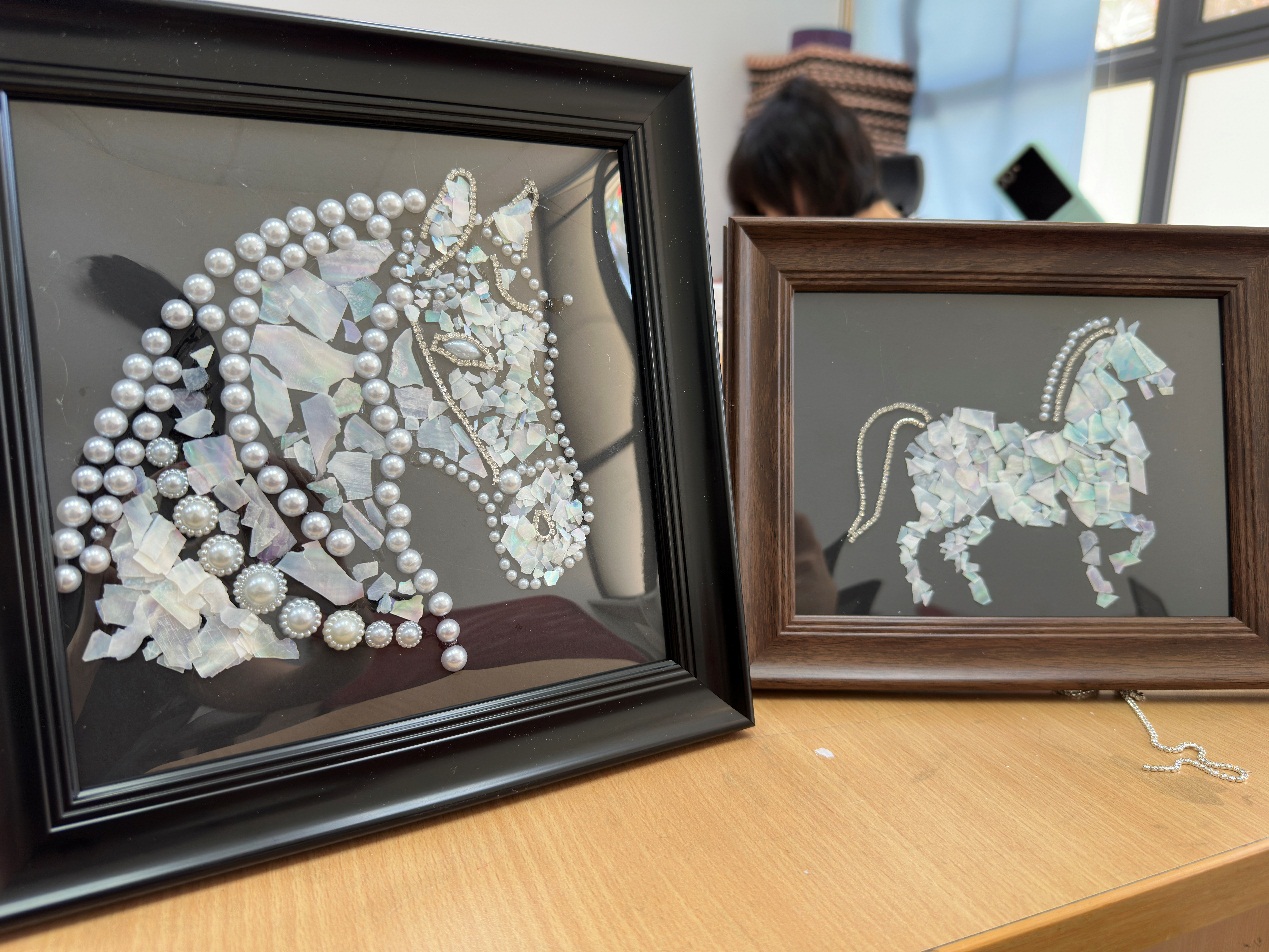 本次活动现场由图书馆部门工会文娱委员丁沫老师担任艺术指导。她现场演示了如何将色彩斑斓的贝壳薄片或青花瓷片镶嵌成精美的图案。随后,女教职工们纷纷化身“匠人”,手执镊子将螺钿、珍珠、瓷片和干花粘在底稿上,现场气氛专注而热烈。原本普通的材料,在一双双巧手的拼贴下,逐渐变成一幅幅构图巧妙、色彩斑斓、独具匠心的作品。看着自己亲手制作的作品,每个人的脸上都绽放笑颜,充满了成就感与喜悦。