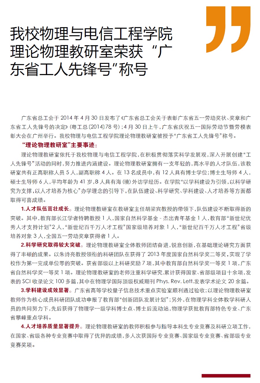 我校物理与电信工程学院物理教研室荣获“广东省工人先锋号”称号