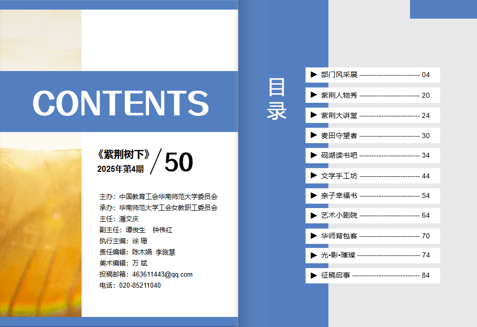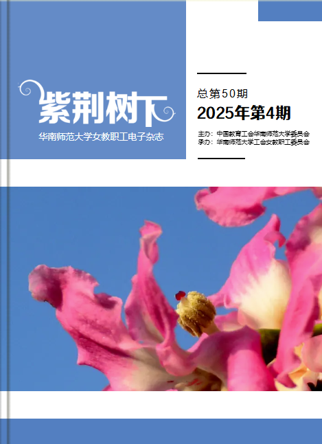华南师范大学女教职工委员会 主任:潘文庆 副主任:谭俊生、钟伟红 执行主编:徐珊 责任编辑:陈木娟、李施慧 美术编辑:万斌 本期出刊:2025年12月 编辑出版:《紫荆树下》编辑部