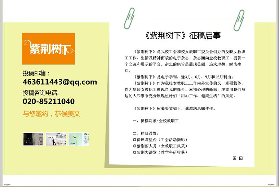 《紫荆树下》是我校工会和校女教职工委员会创办的反映女教职工工作、生活及精神面貌的电子杂志。杂志面向全校教职工,提供一个交流和展示的平台。杂志的宗旨是展现美丽,追求理想,时尚生活。